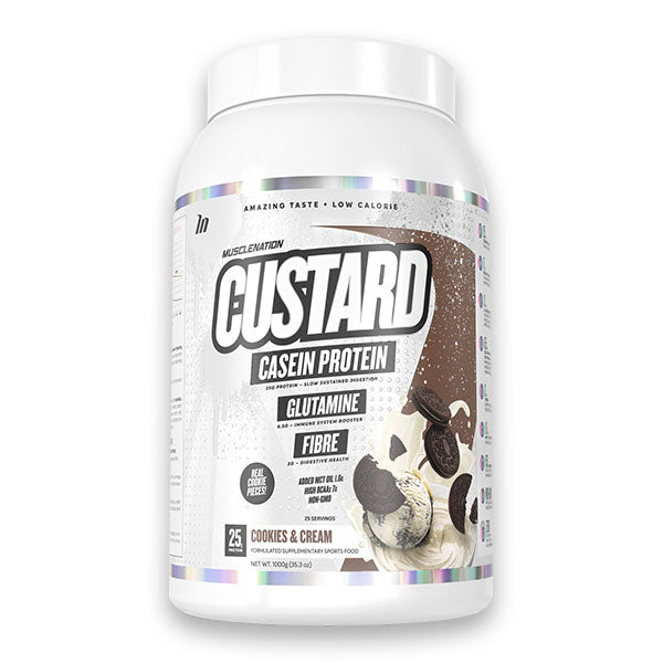 Custard Casein from Muscle Nation is easily one of our best selling products to date. It tastes amazing, its smoother and creamier than we could have ever imagined, and each scoop is so lean and high in protein that we literally can’t fault the formulation. Whether you’re cutting, bulking, or just looking for a quick and healthy solution for a high protein treat, Muscle Nation Custard Casein is your go-to. When it comes to helping you feel full all day, keeping your muscles fuelled for growth, and actually enjoying the taste of your protein, it doesn’t get much better. So go ahead, pour it over your apple crumble, mix it into your morning smoothie, or mix it up in 30seconds at work - either way we know you’ll love it legends!